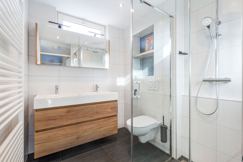 De in 2021 vernieuwde badkamer is modern en luxe afgewerkt met een royale inloopdouche, hangend toilet, wastafel met meubel en vloerverwarming (duurzame CV-verwarming). Een ander fijn kenmerk van de badkamer is de aanwezigheid van natuurlijke ventilatie en daglicht, dit raamkozijn is tevens in kunststof uitgevoerd met kiep functie.
