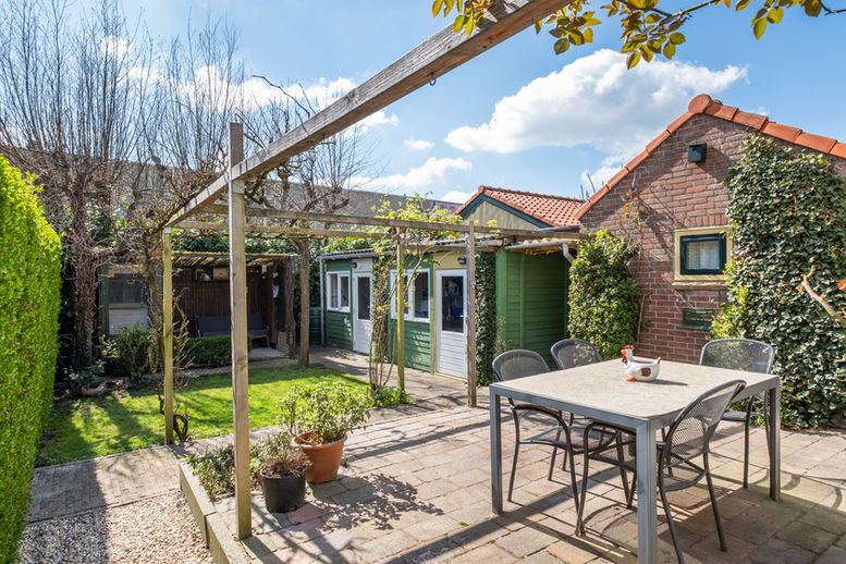 De achtertuin heeft een zonnige ligging op het zuiden (ZZW) en een royale afmeting van ca. 12 meter en 9 meter breed. Verzorgde buitenruimte met een gezellige overkapping en drie vrijstaande bergingen. De eerste berging is voorzien van elektra, water en centrale verwarming. Hier vindt u ook de opstelplaats voor de wasmachine, wasdroger en is er een handig keukenblokje. De andere bergingen zijn eveneens verzorgd en voorzien van elektra en een wateraansluiting.