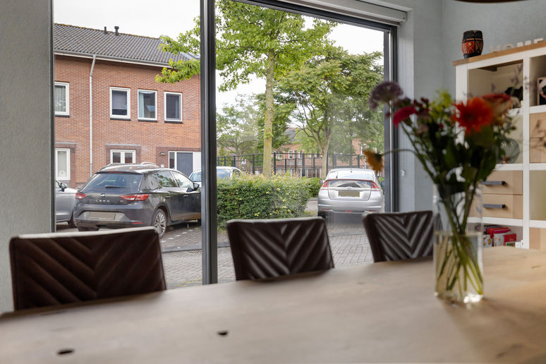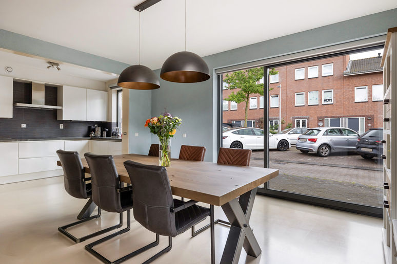 De begane grond heeft een unieke ruime indeling dankzij de grote uitbouw aan de zijkant van de woning; hierdoor is er een royale eetkamer en woonkamer waarbij de open keuken fraai in verbinding staat met beide ruimtes.