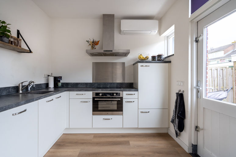 De keuken is voorzien van diverse (inbouwapparatuur); inductie kookplaat, vaatwasser, afzuigkap, spoelbak met Quooker-kraan (heet water), koelkast en combi-oven. Vanuit de keuken toegang naar de zonnige achtertuin met vrijstaande garage.