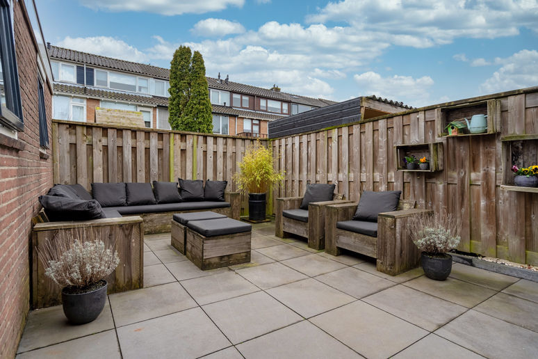 De zonnige achtertuin met een ligging op het zuidoosten is strak en onderhoudsvriendelijk ingericht. Een ruime buitenruimte (ca. 8 x 10 meter) met een vrijstaande stenen garage. Een praktische ruimte van ca. 3.8 x 5.2 meter groot en voorzien van dubbele garagedeur en nieuwe dakbedekking. In de garage is elektra en wateraansluiting aanwezig.