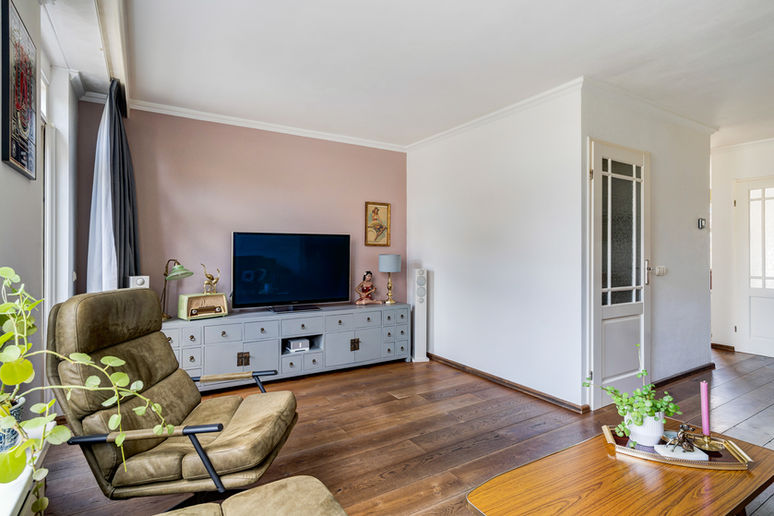 Vanuit de half open keuken een ruime doorgang naar de L- vormige living met eetgedeelte tegenover de keuken en zitgedeelte aan de achterzijde van de woning. De keuken en living beschikt over een mooie eikenhouten vloer.