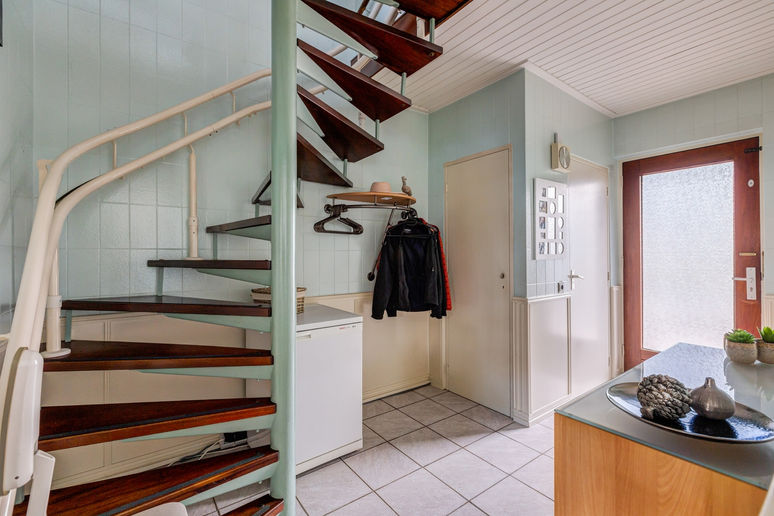 Een fraaie uitbouw met grote raamkozijnen en schuifpui geeft een comfortabele toegang tot de achtertuin, bijkeuken en de aangrenzende garage. De bijkeuken biedt veel extra (opberg)ruimte en een praktische indeling voor wasmachine, wasdroger en eventueel diepvriezer.