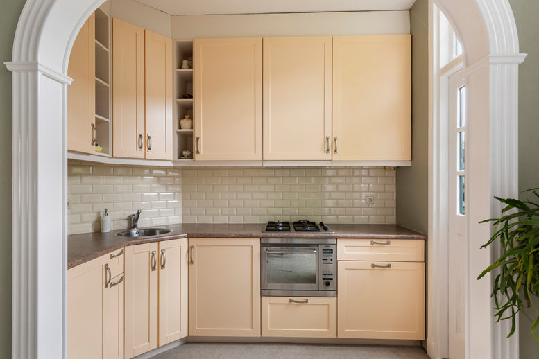 De keuken is slim ingedeeld in een hoekopstelling met diverse inbouwapparatuur zoals; koelkast, 4-pits gaskookplaat, afzuiging en combi-oven.