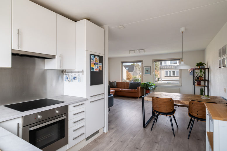 De woonkamer is heerlijk licht dankzij de brede raampartijen aan de achterzijde. Aan de voorzijde bevindt zich de moderne, L-vormige keuken, voorzien van diverse inbouwapparatuur.