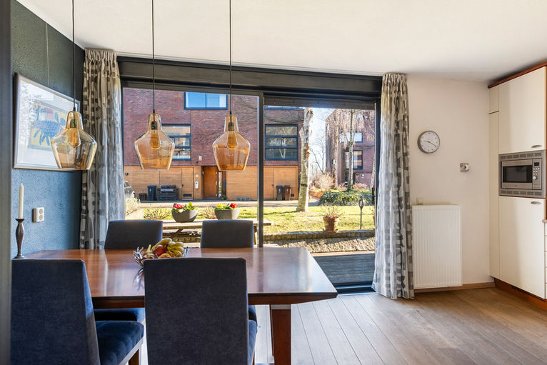Entree met een ruime hal, meterkast, modern toilet, toegang tot de garage, woonkeuken en trap naar de eerste verdieping. De prachtige massief eiken houten vloer is mooi doorgelegd van de entree tot en met de woonkeuken aan de achterzijde van de woning. Een royale, lichte woonkeuken in een hoekopstelling, voorzien van inbouwapparatuur zoals een combi-magnetron, koelkast, vaatwasser en een 6-pits gaskookplaat. Vanuit de keuken biedt een grote schuifpui toegang tot het besloten zonneterras; een heerlijke buitenruimte grenzend aan een rustige, autoluwe straat die alleen gebruikt wordt door bewoners.