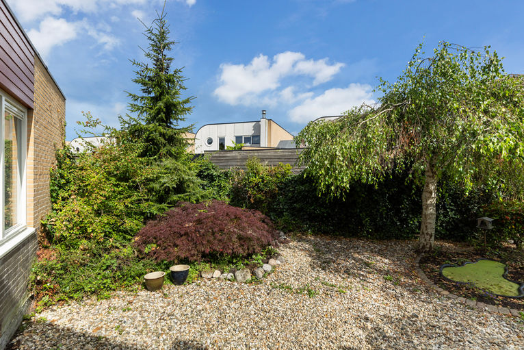 De verzorgde achtertuin is speels vormgegeven en ruim opgezet. Genoeg ruimte voor schaduw en zon gelegen terrassen dat tevens een fraai uitzicht biedt op de omliggende groene omgeving.