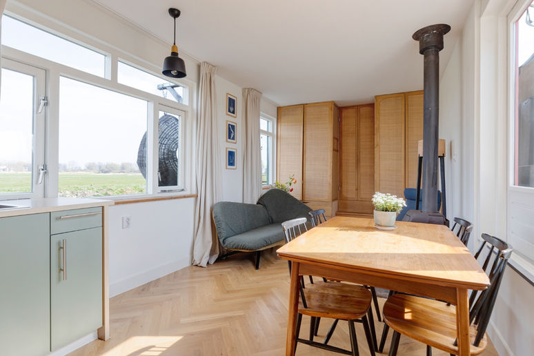 Entree met garderobe en toegang naar de badkamer en woongedeelte. De woonkamer met open keuken is voorzien van een fraaie houten visgraat vloer en sfeervolle houtkachel. De keuken is uitgerust met een inductiekookplaat, afzuigkap, spoelbak, koelkast en combi oven.