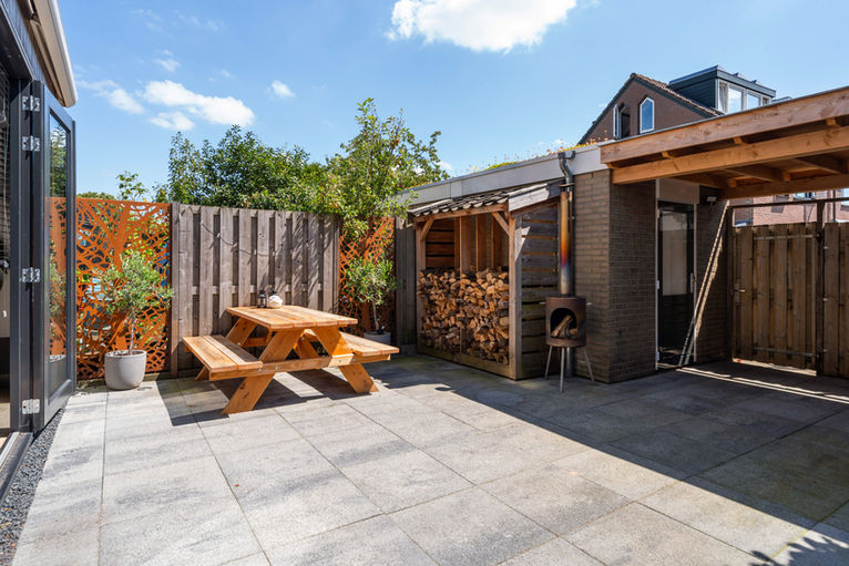 De achtertuin met een zonnige ligging op het zuiden is keurig verzorgd en afgewerkt. De vrijstaande stenen berging met elektra is achterin de tuin gesitueerd waar ook de overkapping is geplaatst (2023). In de achtergevel van de uitbouw is een waterkraan en fraaie muurverlichting.