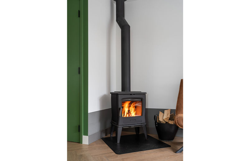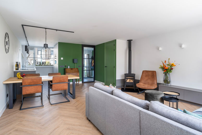 Entree/hal met meterkast, toiletruimte, trap naar de eerste verdieping en toegang naar de woonkamer. De woonkamer is ruimtelijk en licht met een uitbouw aan de achterzijde en extra lichtinval dankzij de hoekligging met zijramen. Een sfeervolle en comfortabele living met houtkachel, vloerverwarming en openslaande deuren naar de achtertuin. De vloer is afgewerkt met een visgraad PVC vloer en doorgelegd op de gehele begane grond.
