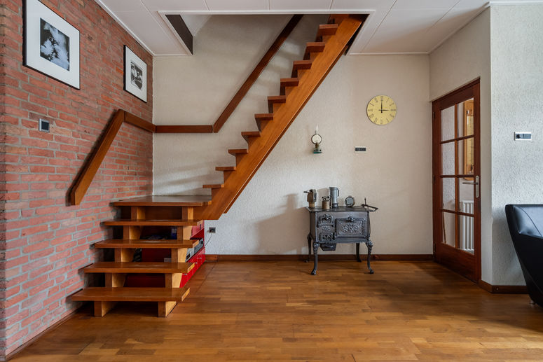 Hal met meterkast en toegang naar de woonkamer. De living is licht en ruimtelijk met een uitbouw aan de achterzijde, open keuken situatie en een hoog plafond. De openslaande deuren brengt de zonnige achtertuin mooi in verbinding de woonkamer en keuken. Het toilet heeft een praktisch voorportaal met een vaatwasser/wasmachine aansluiting. De keuken is voorzien van een tegelvloer en woonkamer met een eiken parketvloer. Een trap in de woonkamer leidt u naar de eerste verdieping.
