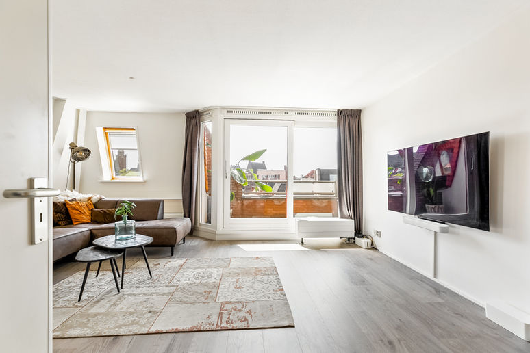 De woonkamer met open keuken biedt een bijzonder fijne living; de beschikking over een ochtend, middag en avondzon in deze ruimte is een uniek kenmerk in deze prijsklasse. Met een grote glazen schuifpui op het zuidwesten en de drie van de vier (dak)ramen op het zuidoosten is er een weids uitzicht op het historische stadshart van Gouda. De buitenruimte van ca. 3 x 1,5 meter is fraai vormgegeven en staat mooi in verbinding met de living. Een uniek uitzicht op De Waag, Sint-Janskerk, Gouwekerk, Agnietenkapel en het historische stadhuis van Gouda.